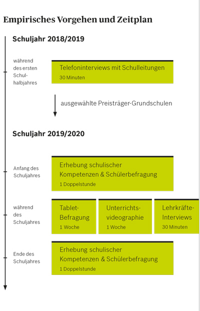 Um die Expertise der Preisträgerschulen Deutschen Schulpreises von Beginn an einzubeziehen, werden im Schuljahr 2018/2019 zunächst Interviews mit den Schulleitungen aller Preisträgerschulen im Primarbereich zur Praxis des individualisierten Unterrichts geführt. Im Anschluss daran wird der Unterricht an ausgewählten Schulen während des Schuljahres 2019/2020 mittels verschiedener Erhebungsverfahren in den Blick genommen. Herzstück der Erhebungen werden dabei die Kurzbefragungen der Schüler*innen nach jeder Unterrichtsstunde während einer Woche mittels Tablet-Computern sowie die zeitgleich stattfindende Videographie des Unterrichts sein.