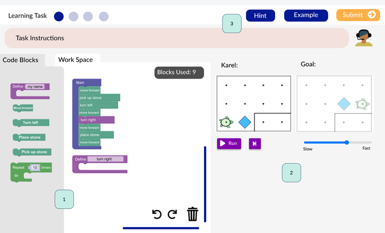 Beispielsweise sollen Schüler*innen in einer Lerneinheit durch Kombinieren von Befehlen, die als Blöcke zur Auswahl stehen, ein Programm erstellen, um damit eine Spielfigur zu steuern (s. Schildkröte in Abb. 1). Die Spielfigur soll etwa dazu gebracht werden, ein Objekt einzusammeln und sich dann zur Zielposition zu bewegen. Dabei können die Schüler*innen ihre programmierte Lösung immer wieder mithilfe einer Testmöglichkeit selbst überprüfen, unterstützendes Feedback erhalten und unter Nutzung von Lernmaterialien weiter verbessern.