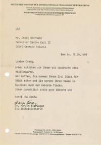 Die Karten aber strömen – zur Verzweiflung der Post und später der Familie – dennoch weiter: Jemand hat Craigs Bitte in einen Kettenbrief verwandelt, der schließlich Deutschland und 1994 auch die Bibliothek für Bildungsgeschichtliche Forschung erreicht. Aus Craig Shergold ist „Craig Sherhold aus Atlanta“  geworden (andere bekannte Varianten lauten Shelford, Shepard oder Sherwood), und statt um Genesungswünsche wird um Visitenkarten gebeten. Die im Institutsarchiv erhaltenen Unterlagen lassen das Ausmaß der Aktion erahnen: Allein hier sind über fünfzig Postanschriften in Deutschland, Großbritannien, den Niederlanden und der Schweiz verzeichnet, an die der Brief im Frühjahr 1994 versendet wurde. Auch die BBF reicht den Wunsch an neun Berliner Bibliotheken und die Frankfurter Forschungsbibliothek des DIPF weiter.